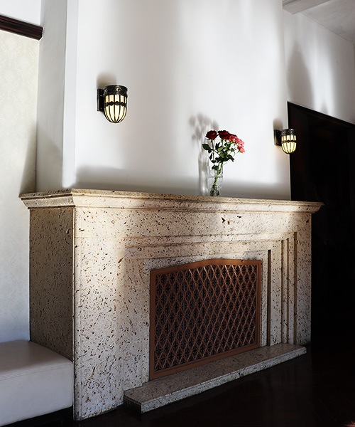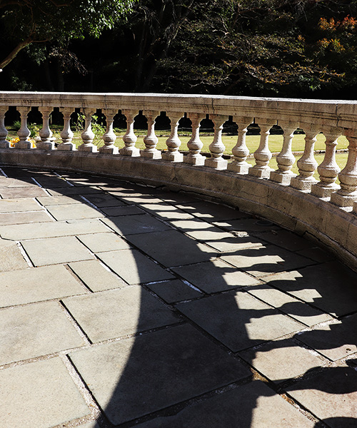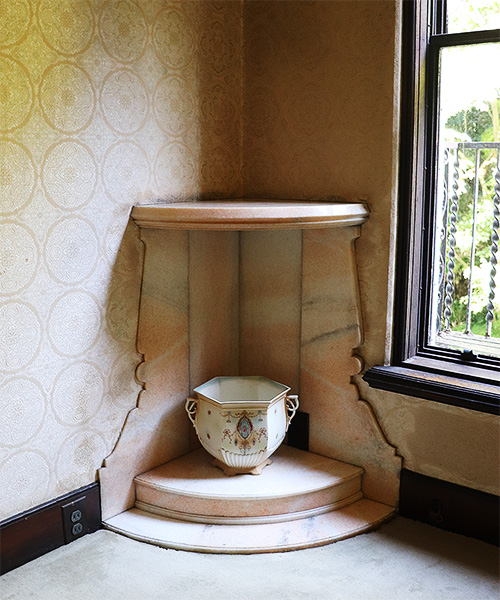 外観はハーフティンバースタイル(柱や梁などの木造の構造材を意図的に外部に露出し、その間の壁面をレンガや漆喰などで埋めて作られる建築様式)で、厳かな門、馬車回し、敷地内外の喬木の緑、広々としたフランス式庭園などと一体となり、往時の華やかな生活ぶりが想起させられます。